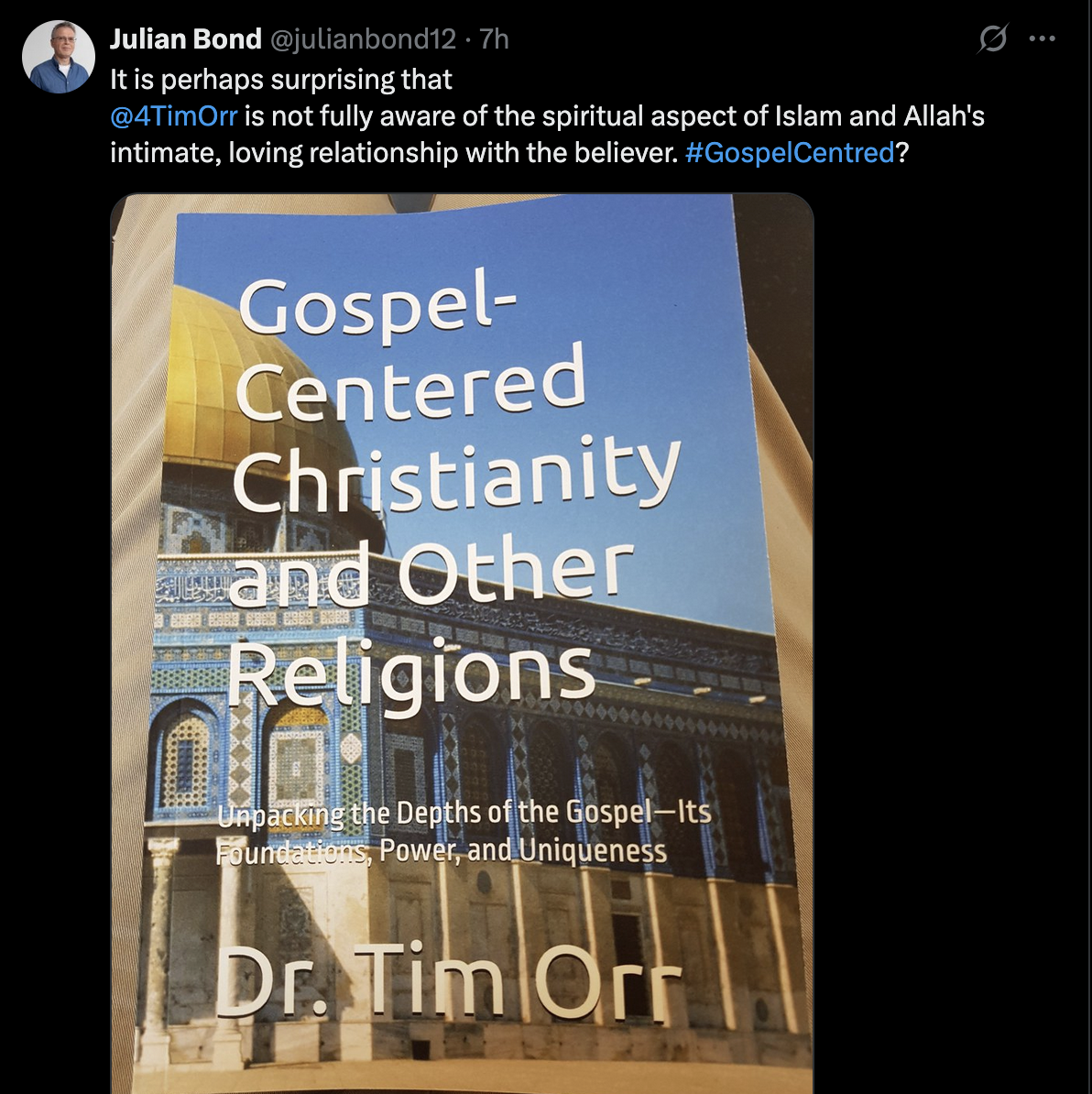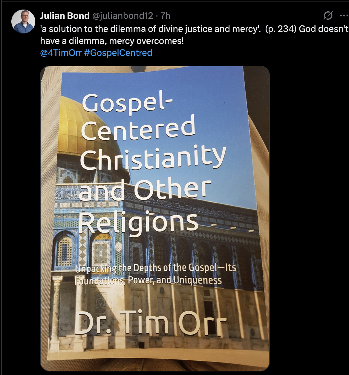 Julian Bond’s tweet—“God doesn’t have a dilemma, mercy overcomes!”—was aimed at my statement that the gospel offers “a solution to the dilemma of divine justice and mercy” (p. 234). But his comment reflects more than just a difference of opinion—it reveals something deeper about the framework he’s operating from. From what I can see, his view is shaped both by Islamic theology and by years of interfaith work that tend to blur the lines between major truth claims. In Islam, God’s mercy is given simply by divine will—“He forgives whom He wills” (Qur’an 39:53)—without cross, sacrifice, or necessary reckoning for sin. But this kind of mercy skips over the weight of human guilt. It treats forgiveness like a divine wave of the hand rather than a costly act of justice.